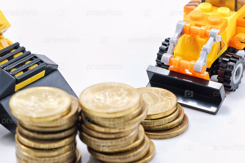 Игрушечный бульдозер собирает кучу золотых монет в кучу