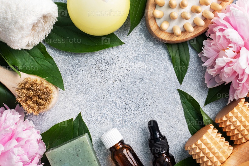 Концепция СПА и велнес. Массажная щетка, косметические масла и мыло. Светлый фон с цветами пиона. Копировать пространство
