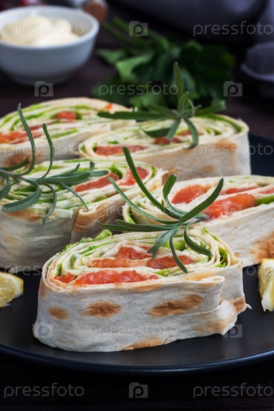 Рулеты из тонкого лаваша и красного соленого лосося с листьями салата на черной керамической тарелке, темный деревянный фон