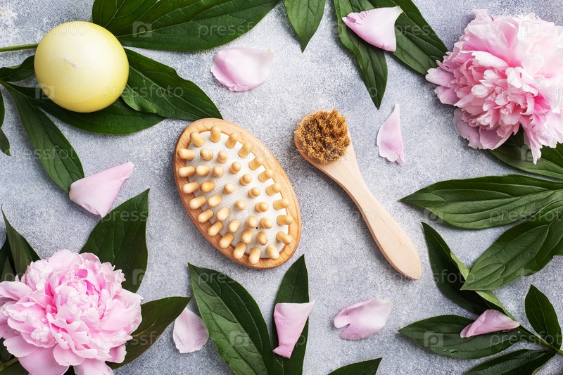 Концепция СПА и велнес. Массажная щетка, косметические масла и мыло. Светлый фон с цветами пиона