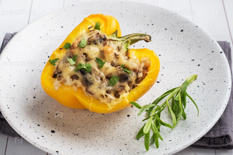 Сладкий перец, фаршированный рисовыми грибами и сыром с зеленью. Запеченные половинки желтого перца с начинкой. Белый деревянный фон
