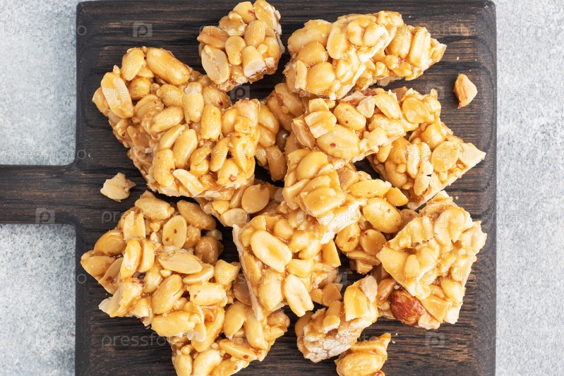 Арахис в сахарной глазури, восточная сладость ломкой. Козинаки разбиты на куски на деревянной доске, место для копирования. вид сверху