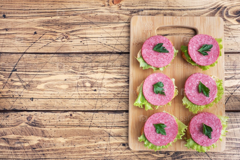 Бутерброды с листьями салата и нарезанной колбасой салями на деревянной доске. пространство для копирования вид сверху