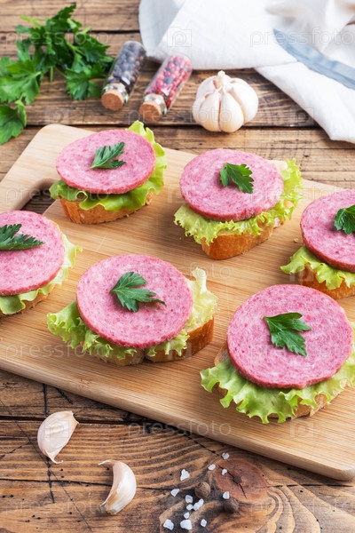 Бутерброды с листьями салата и нарезанной колбасой салями на деревянной доске