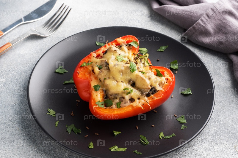Сладкий перец, фаршированный рисовыми грибами и сыром с зеленью. Запеченные половинки красного перца с начинкой. Серый бетонный фон