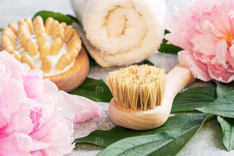 Концепция СПА и велнес. Массажная щетка, косметические масла и мыло. Светлый фон с цветами пиона