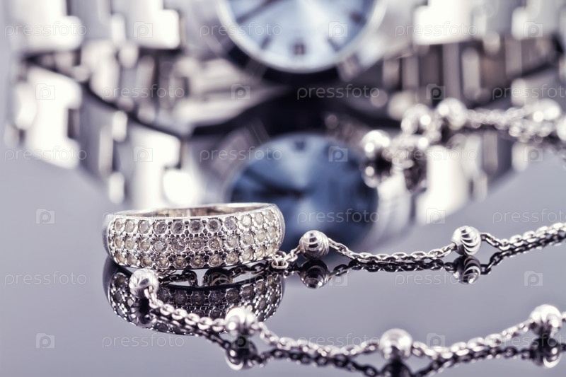 Серебряное кольцо и цепочка на фоне женских часов