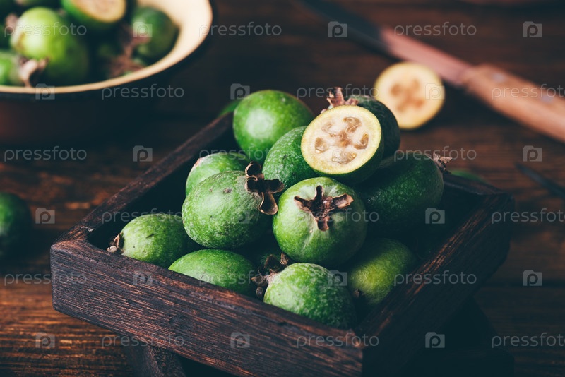 Плоды фейхоа в деревенском деревянном ящике