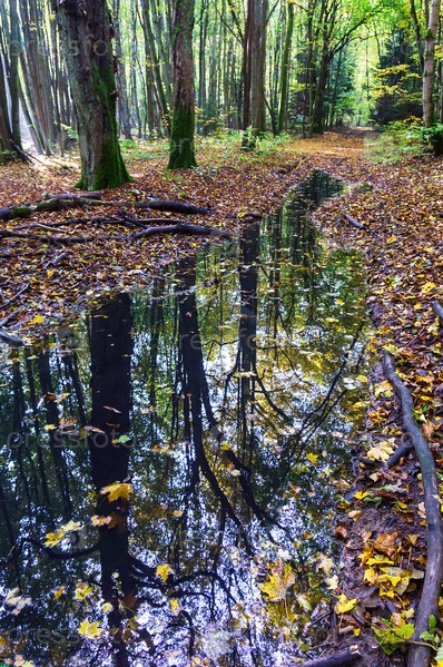 Осенний лес. Желтые и красные листья на деревьях осенью. Лесная дорога