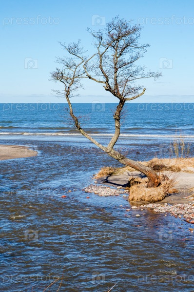 Одинокое дерево на берегу моря. Живописный морской пляж