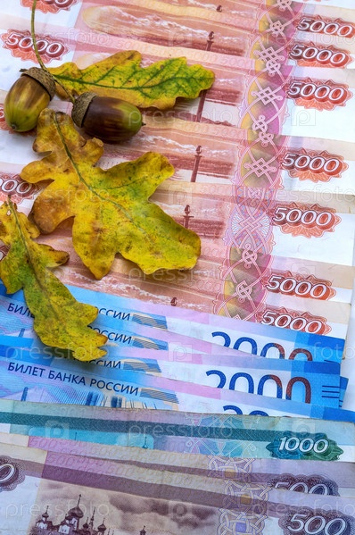 Деньги на осенних листьях. Русские деньги и дубовые листья. Осенний натюрморт