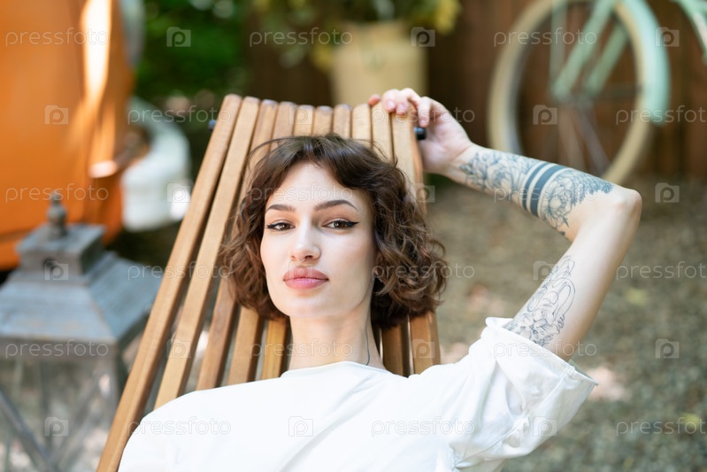 Молодая красивая женщина сидит в кресле на открытом воздухе летом