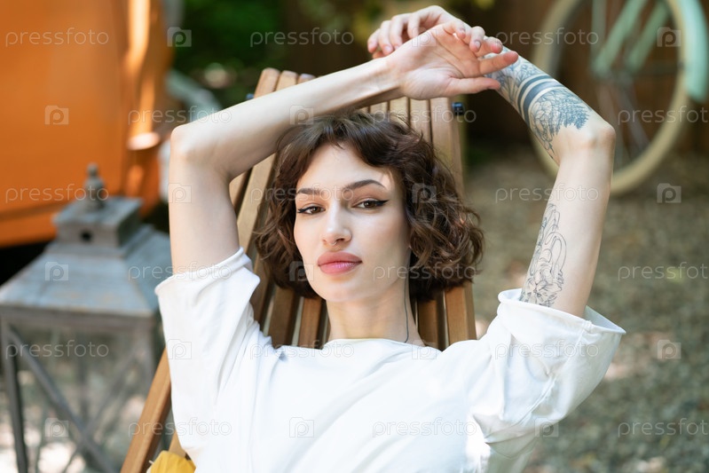 Молодая красивая женщина сидит в кресле на открытом воздухе летом