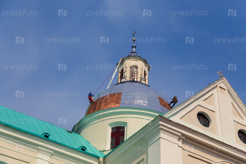 Рабочие выполняют работы по замене крыши в католической церкви. На эту работу требуются работники с навыками промышленного альпинизма