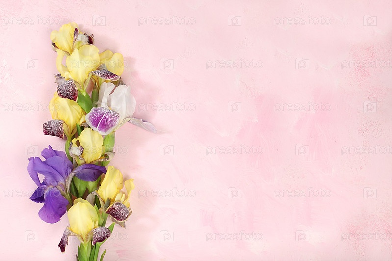 Красивый букет разных ирисов на светлом фоне, плоская планировка абстрактной цветочной композиции, минимальная концепция и натюрморт, летний баннер. Креативный современный букет. Открытка на день матери, с днем рождения, свадьба, узор