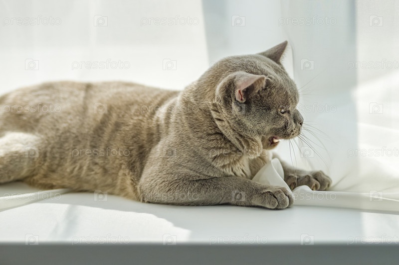 Домашний бирманский кот, серый с желтыми глазами, в многоквартирном доме города. Он эффектно лежит на подоконнике. Естественная среда обитания