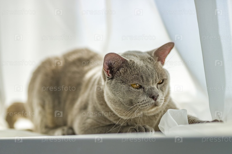 Домашний бирманский кот, серый с желтыми глазами, в многоквартирном доме города. Он эффектно лежит на подоконнике. Естественная среда обитания