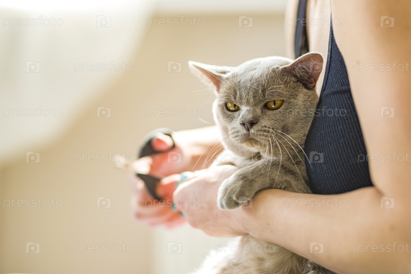 Домашний бирманский кот, серый с желтыми глазами, на руках у хозяина. Он не любит, когда ему подстригают когти. Уход за кошкой. Естественная среда обитания