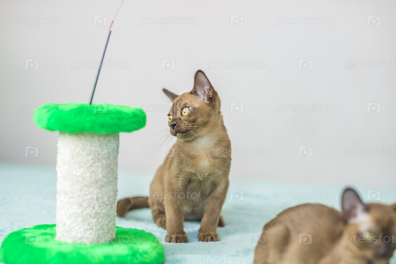 Молодые домашние котята бирманской породы, коричневые, играют с игрушкой на стенде в многоквартирном доме города. Естественная среда обитания