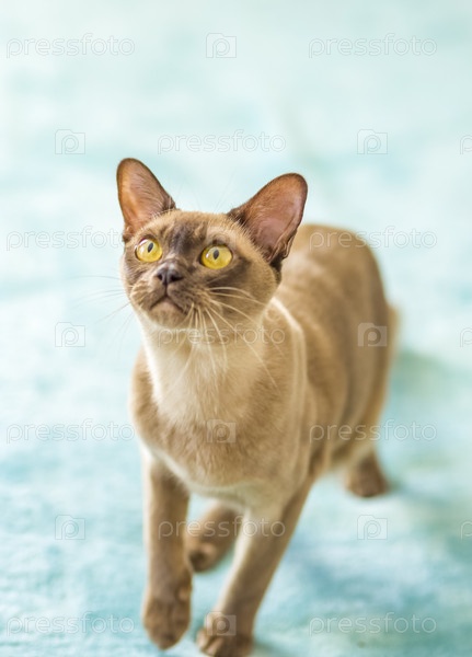 Домашняя кошка бирманской породы, коричневая с желтыми глазами, в многоквартирном доме города. Любит лежать на диване. Портрет животного. Естественная среда обитания
