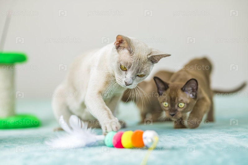 Домашняя кошка бирманской породы, игривая и активная, в многоквартирном доме города. Любит игрушки и бантики. Глаза счастливого питомца, играющего и желающего напасть