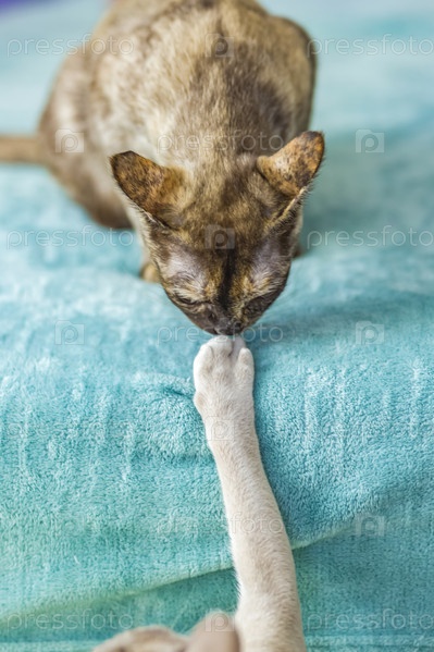 Домашняя кошка бирманской породы, игривая и активная, в многоквартирном доме города. Любит игрушки и бантики. Глаза счастливого питомца, играющего и желающего напасть