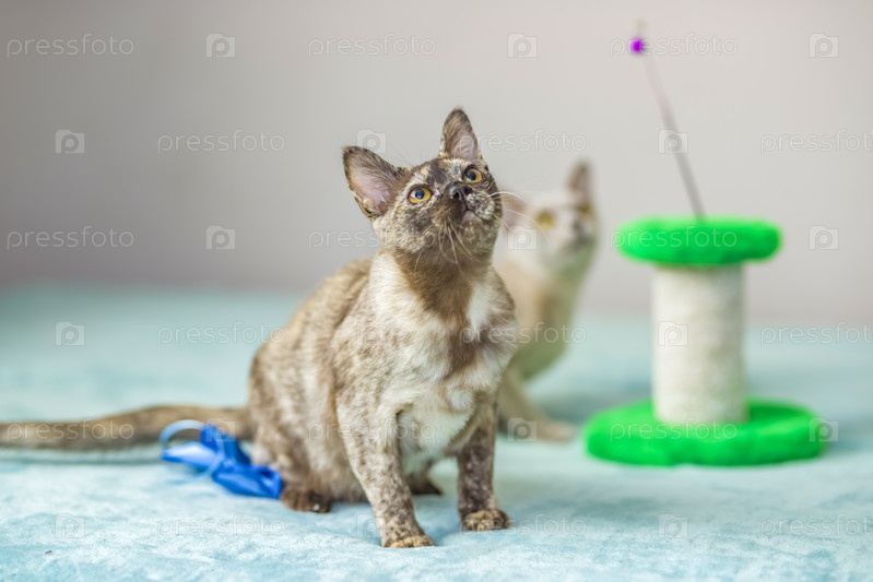 Домашняя кошка бирманской породы, игривая и активная, в многоквартирном доме города. Любит игрушки и бантики. Глаза счастливого питомца, играющего и желающего напасть