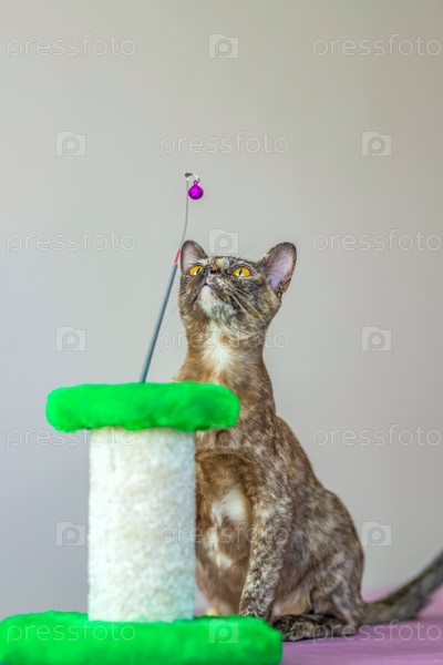 Домашняя кошка бирманской породы, игривая и активная, в многоквартирном доме города. Любит игрушки и бантики. Глаза счастливого питомца, играющего и желающего напасть