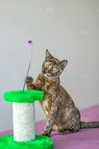 Домашняя кошка бирманской породы, игривая и активная, в многоквартирном доме города. Любит игрушки и бантики. Глаза счастливого питомца, играющего и желающего напасть