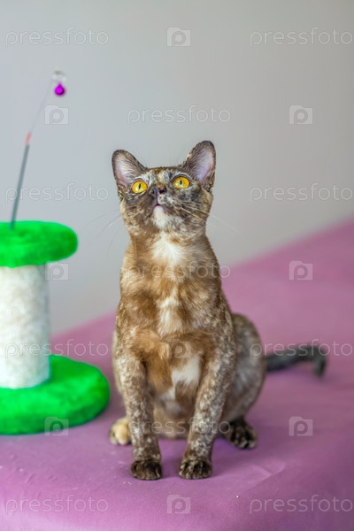 Домашняя кошка бирманской породы, игривая и активная, в многоквартирном доме города. Любит игрушки и бантики. Глаза счастливого питомца, играющего и желающего напасть