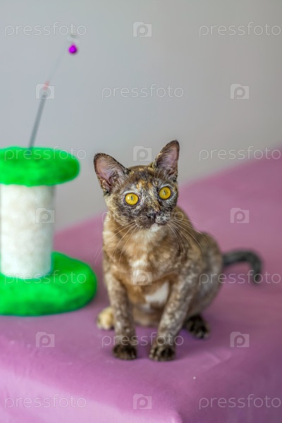 Домашняя кошка бирманской породы, игривая и активная, в многоквартирном доме города. Любит игрушки и бантики. Глаза счастливого питомца, играющего и желающего напасть