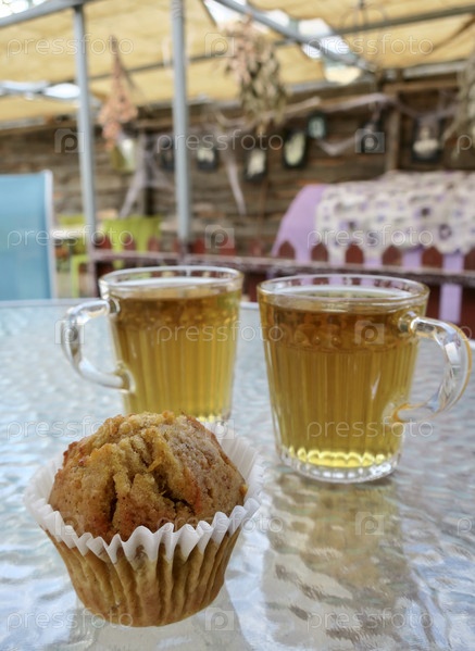 Домашний кекс с фруктами и двумя кружками травяного чая на столе из стекла на экологической ферме на Кипре