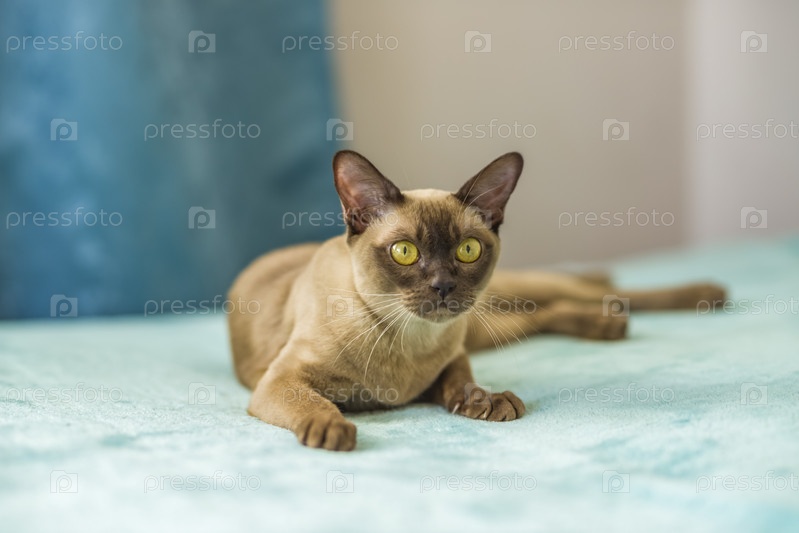 Домашняя кошка бирманской породы, коричневая с желтыми глазами, в многоквартирном доме города. Любит лежать на диване. Портрет животного. Естественная среда обитания