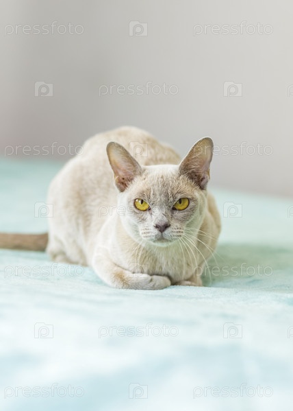 Домашняя кошка бирманской породы цвета шампанского с желтыми глазами в городском многоквартирном доме. Любит лежать на диване. Портрет животного