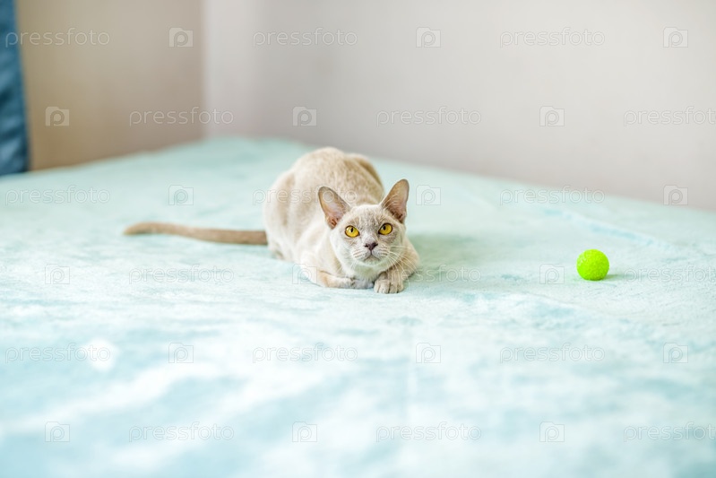 Домашняя кошка бирманской породы цвета шампанского с желтыми глазами в городском многоквартирном доме. Любит лежать на диване. Портрет животного