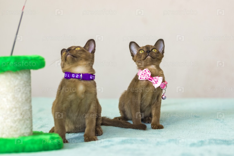 Молодые домашние котята бирманской породы, коричневые, играют с игрушкой на стенде в многоквартирном доме города. Естественная среда обитания