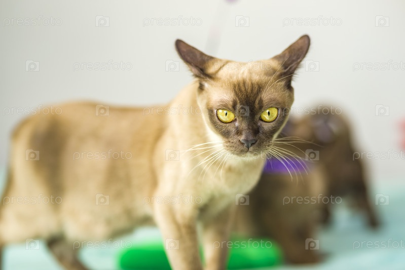 Домашняя кошка бирманской породы, коричневая с желтыми глазами, в многоквартирном доме города. Любит лежать на диване. Портрет животного. Естественная среда обитания