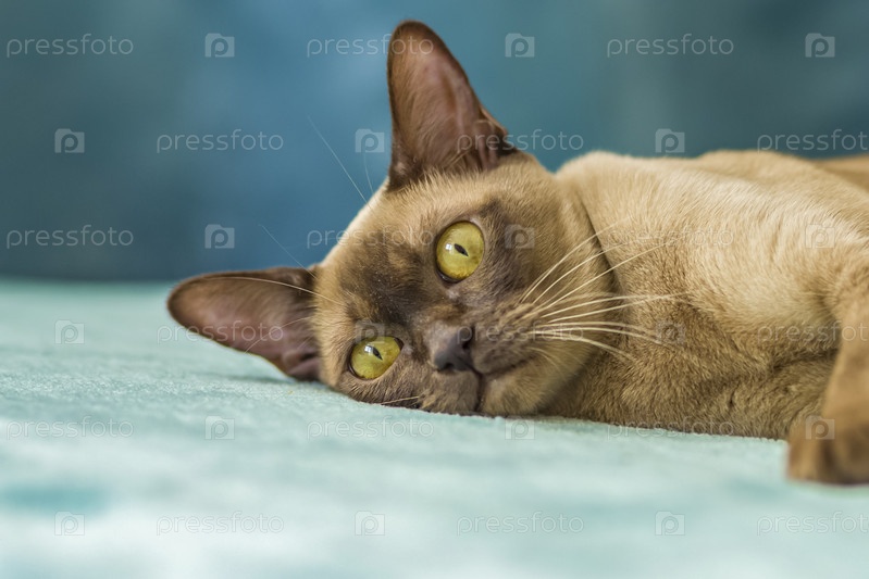 Домашняя кошка бирманской породы, коричневая с желтыми глазами, в многоквартирном доме города. Любит лежать на диване. Портрет животного. Естественная среда обитания
