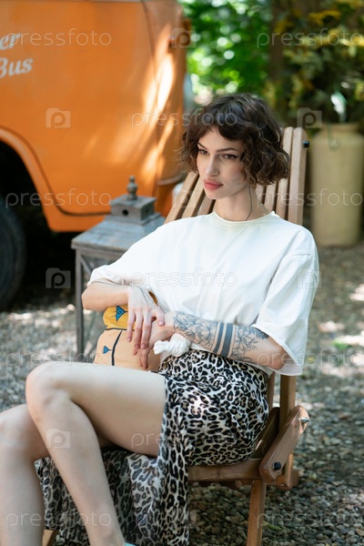 Молодая красивая женщина сидит в кресле летом на улице