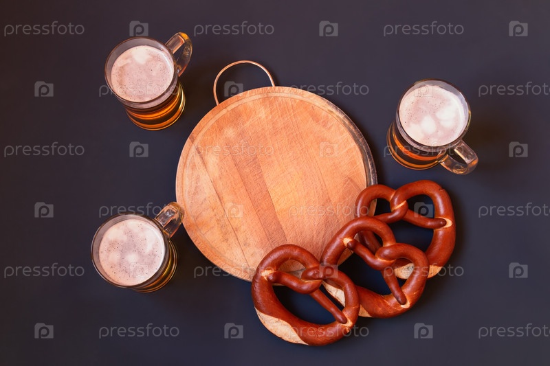 Пивные кружки и мягкие крендельки вокруг разделочной доски на темном фоне. Вид сверху, пространство для копирования