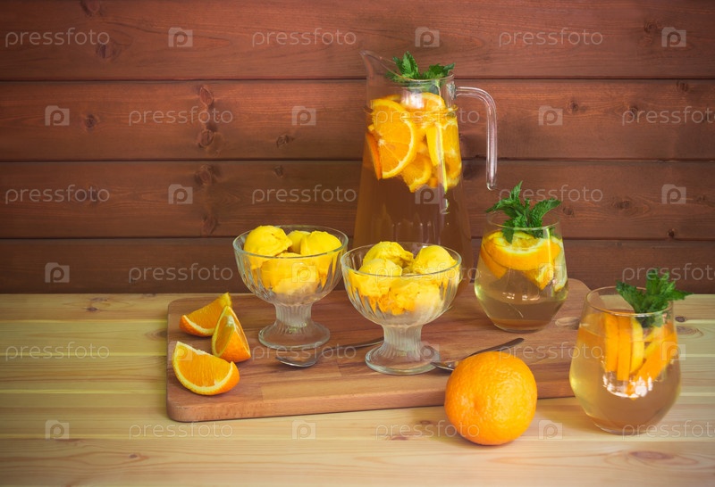 Апельсиновый лимонад, апельсиновое мороженое и свежие апельсины на разделочной доске на деревенском деревянном столе. Выборочный фокус