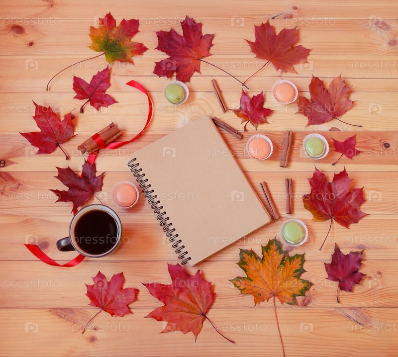 Пустой блокнот, кружка кофе, осенние кленовые листья и миндальное печенье на деревянном столе. Вид сверху, пространство для копирования
