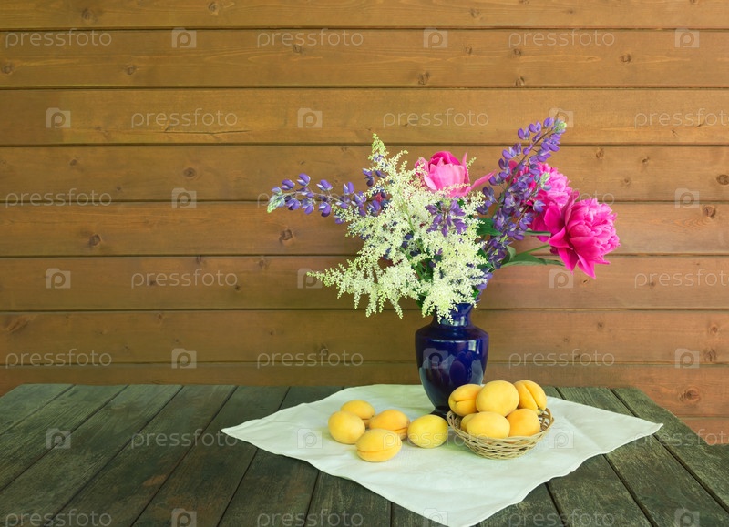 Красивый букет астильбы, люпина и пионов в синей вазе и свежих абрикосов рядом на деревенском деревянном столе