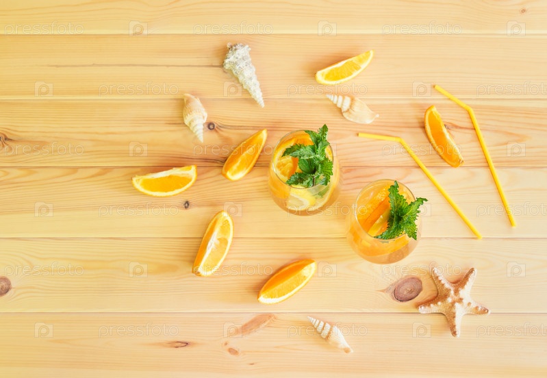 Холодный летний апельсиновый лимонад на деревянном столе, соломинки для питья, морские звезды и ракушки рядом. Вид сверху