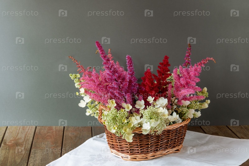 Красные, белые и розовые цветы астильбы и гортензии в плетеной корзине на деревянном столе. Выборочный фокус. Просмотр с копией пространства