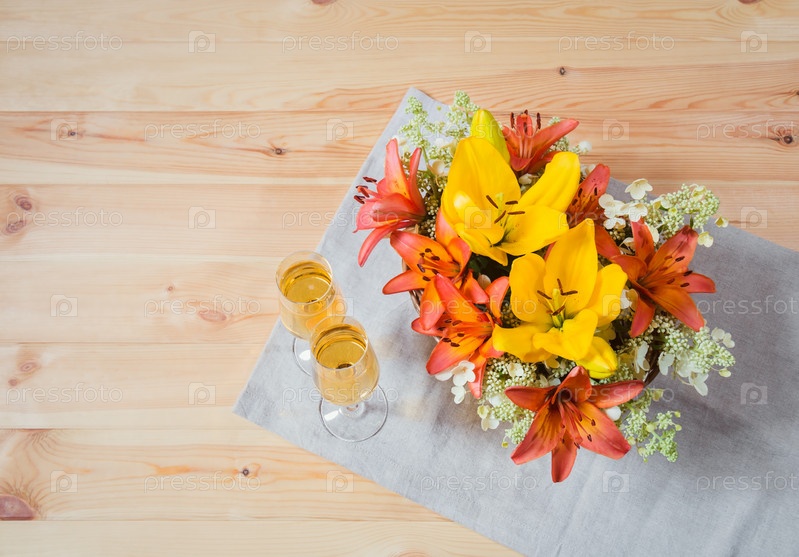 Букет оранжевых и желтых лилий и белых цветов гортензии и бокалы шампанского на деревянном столе. Вид сверху, пространство для копирования