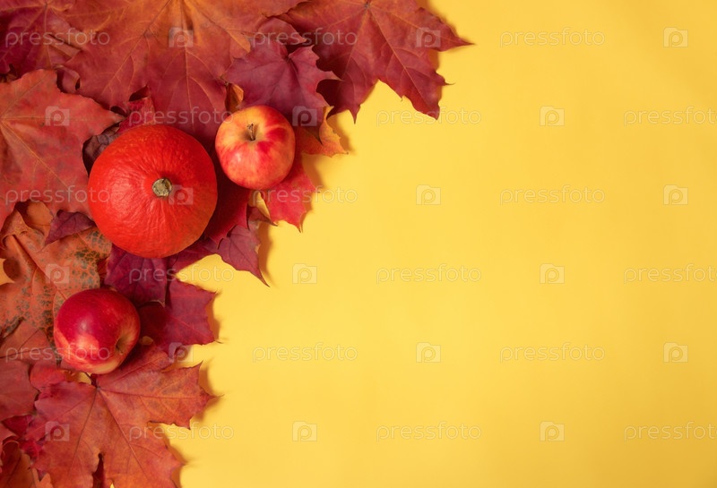 Граница из красочных осенних кленовых листьев, тыквы и яблок на желтом фоне с копировальным пространством