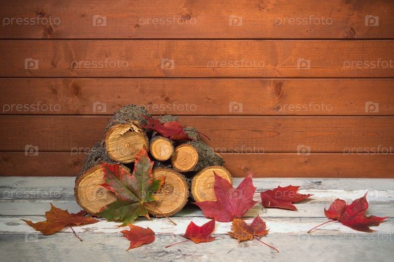 Куча дров и осенних кленовых листьев на состаренной деревянной поверхности. Просмотр с копией пространства