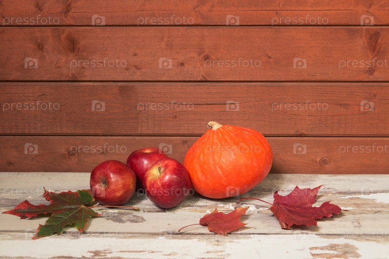 Яблоки и тыква на состаренном деревянном столе. Просмотр с копией пространства
