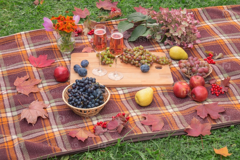 Осенний пикник на открытом воздухе с розовым шампанским, фруктами и цветами. Выборочный фокус